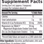 50 mg of stabilized vitamin B6 • Chelated forms of magnesium and zinc for enhanced absorption and bioavailability • Convenient liquid delivery method • Delicious raspberry flavored liquid • No artificial flavors or sweeteners • Naturally sweetened with glycerine
