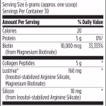 Features Lustriva®, a patented and clinically researched blend of stabilized biotin and silica • Collagen peptides help promote healthier-looking skin and hair* • Magnesium biotinate shown to have 40 times greater dissolvability and absorption than biotin used in common beauty products* • Unflavored and unsweetened powder for optimal mixing with liquids • Gluten-free, dairy-free, soy-free, and non-GMO