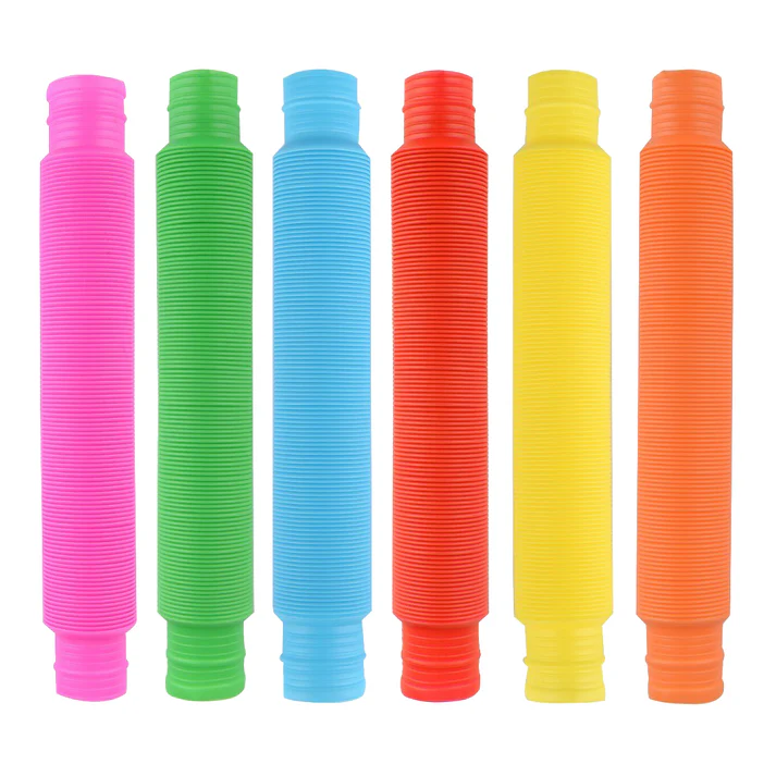 Fun Pop Tubes are colorful, bendable, snappable tubes that can be connected together to create longer tubes and different shapes! These plastic tubes come in a variety of colors and are designed to stretch and make great sounds. Each 8-inch tube expands 4-times its original length and is connectable with other Pop Tubes. Children love wrapping them around their head and hands to make colorful jewelry, make longer tubes or build a small fort. Pop Tubes create a popping sound as you expand and compress the tubes or twirl them around in a circle to make them whistle. They are durable tubes that come in assorted colors and make great items for party favors, grab bags, and prizes. Stretch them, bend them, connect them, this sensory toy will be hard to put down because there are so many ways to play and fiddle with a Slinky Pop Tube!