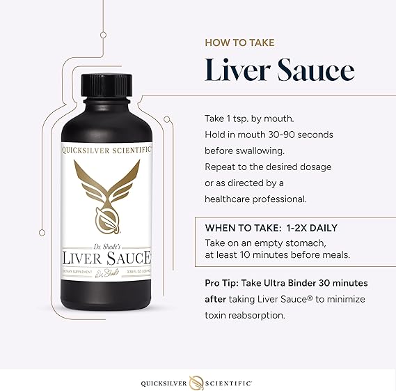 To optimize your detoxification experience and minimize toxin reabsorption, we recommend pairing Liver Sauce with Ultra Binder®, a universal toxin binder formulation. General dosing recommendation: Take 1 tsp of Liver Sauce on an empty stomach (hold in the mouth 30-90 seconds before swallowing). Wait 30 minutes. Take 1 dose of Ultra Binder. Wait another 30 minutes before eating. Always work with your healthcare provider for individualized support.
