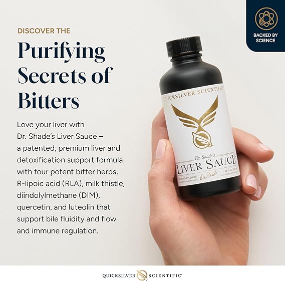 Dr. Shade’s Liver Sauce® is a patented, premium liver and detoxification support formula. This nanoformulated liquid blend features four potent bitter herbs (dandelion, gentian, goldenrod and myrrh) to aid bile fluidity and flow, along with powerful liver, detoxification, and immune regulating support from R-lipoic acid (RLA), milk thistle, diindolylmethane (DIM), quercetin, and luteolin.*  Liver Sauce is one of the products in our patented PushCatch ® Liver Detox System and many of our other signature detoxification protocols.