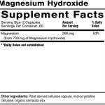 Serving Size: 2 Capsules Amount Per Serving % Daily Value Servings Per Container: 60. Ingredients: Magnesium (from 700 mg of Magnesium Hydroxide) 266 mg 63%, Other Ingredients: Plant-derived cellulose capsule, microcystalline cellulose, organic carnauba wax