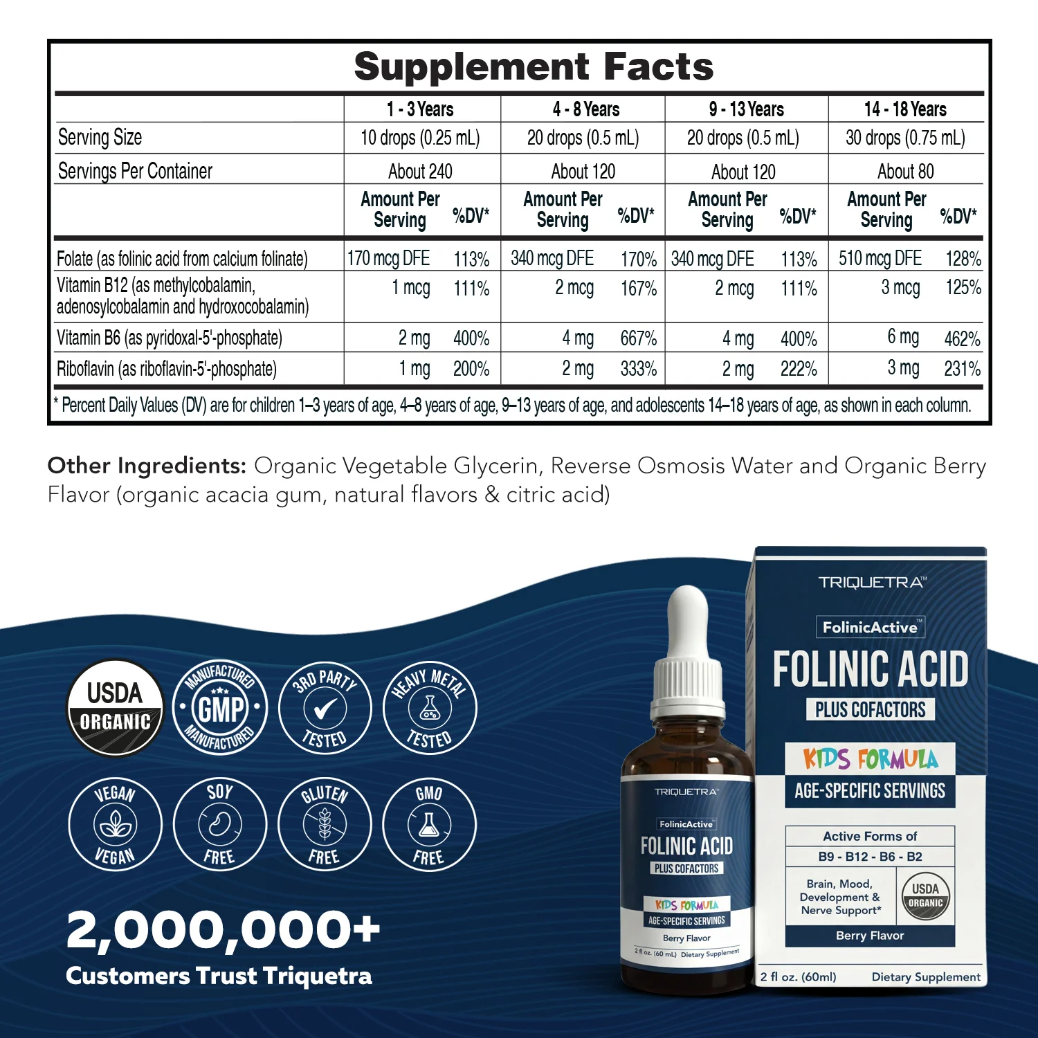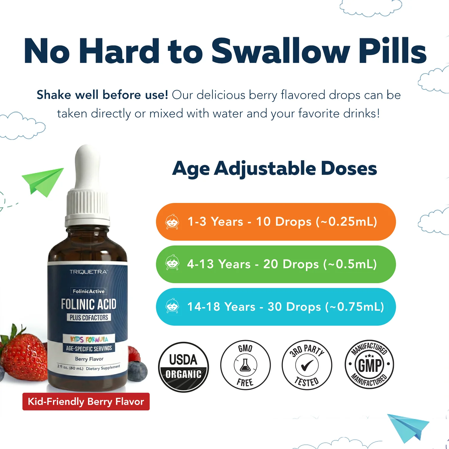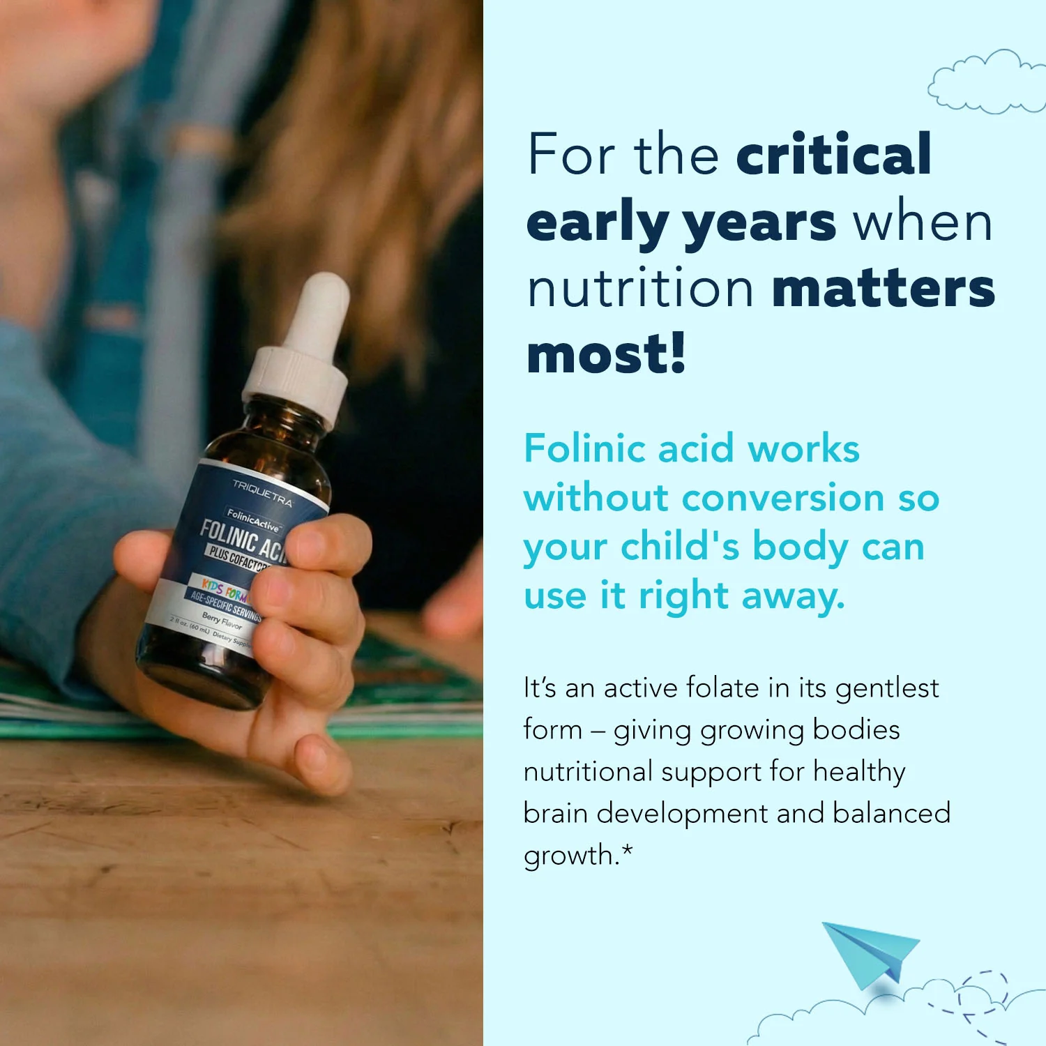 FolinicActive™ Kids Drops is a gentle, child-friendly folinic acid supplement designed to support healthy brain development, balanced mood, steady energy, and overall growth in children ages 1–18. It features Folinic Acid (Vitamin B9), a non-methylated and already-active form of folate that works without conversion, allowing the body to use it immediately for daily nutritional support.