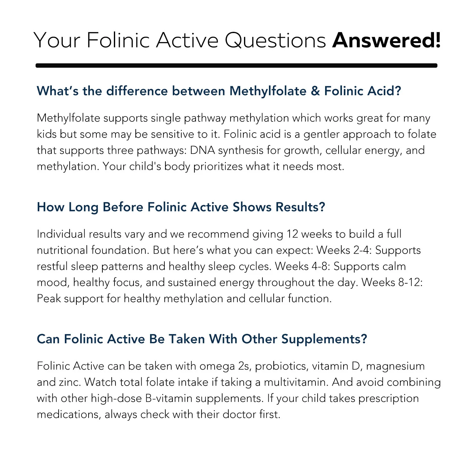 - Contains Folinic Acid, a gentle non-methylated active folate
