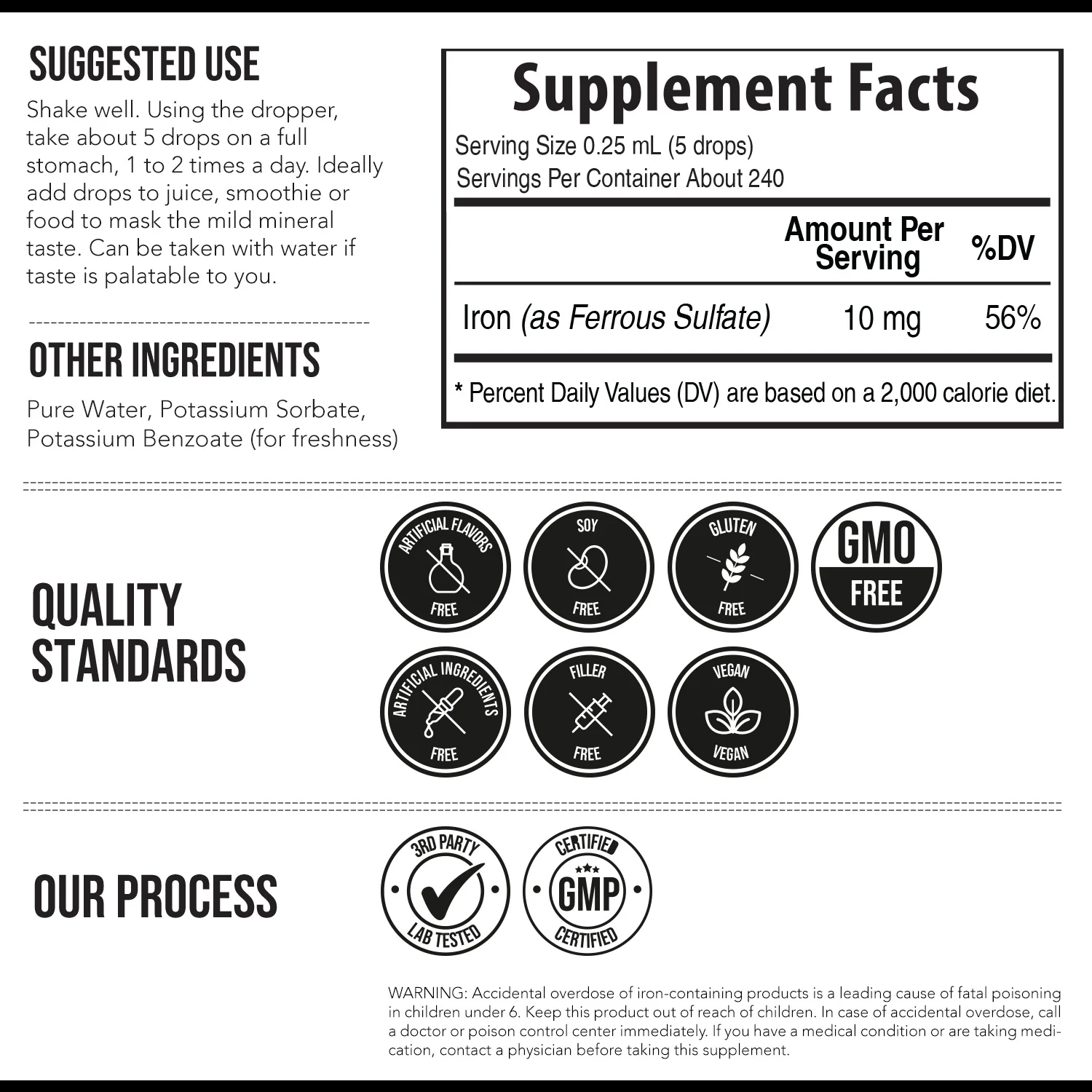 Ionic Iron Liquid Supplement is a highly absorbable liquid iron formula designed to support healthy iron levels, energy production, and overall wellness. It uses ionic ferrous sulfate, a bioavailable form of iron that helps the body absorb nutrients more efficiently compared to many traditional synthetic iron supplements. The product is designed as a concentrated liquid for small, stomach-friendly doses and can be easily added to water, juice, or other beverages.